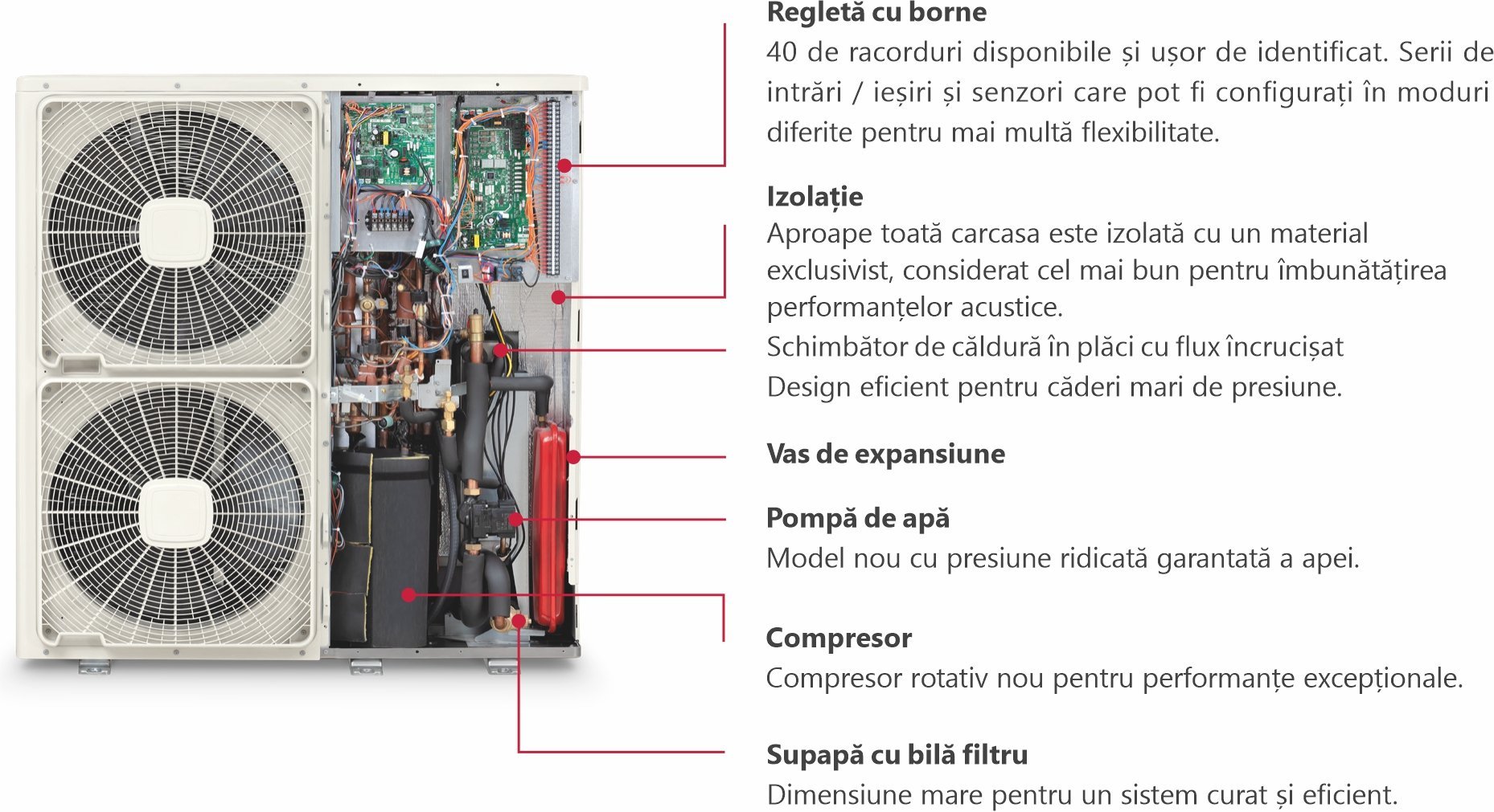 Seria Yutaki S este o soluție split: circuitul frigorific leagă unitatea exterioară de hidromodulul interior, oferind flexibilitate la instalare și opțiuni avansate de control. Seria Yutaki M este monobloc: întregul circuit frigorific se află în unitatea exterioară, iar către interior intră doar racorduri hidraulice — ideal atunci când spațiul în casă este limitat sau vrei instalare rapidă, fără manipularea agentului frigorific. Indiferent de serie, arhitectura rămâne „plug & play” din punct de vedere hidraulic și electric, cu acces facil la componente pentru service.